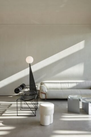 L’inspiration vient d’une collection de pierres trouvées sur les rives de la mer Rouge. À partir de ces formes organiques, le studio a conçu un espace où la matière, la lumière et la texture prennent le dessus sur le décoratif.