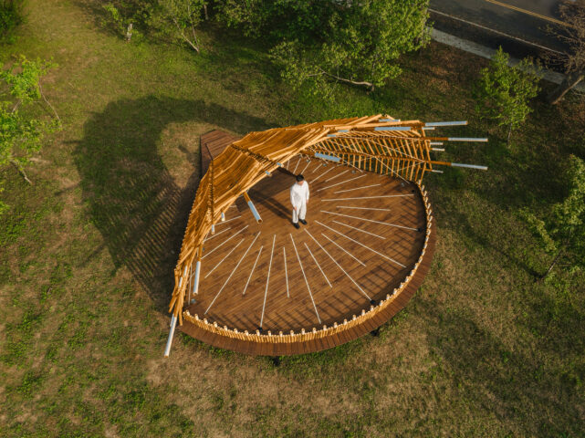 À l’avant de la scène, la bordure en bambou s’ordonne avec précision, tandis que des bandes blanches convergent vers le centre, prolongeant la géométrie rayonnante du théâtre. L’artiste relie ainsi tradition et modernité, conjuguant la mémoire des fêtes populaires à une conception minimaliste.