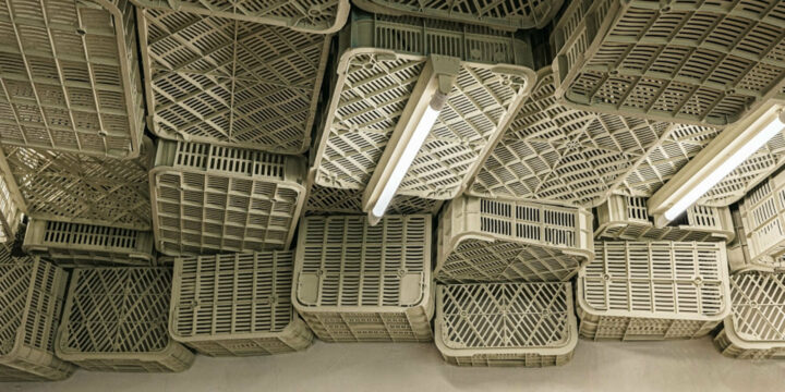L’élément le plus saisissant du projet se trouve au-dessus des têtes. Le plafond est constitué de plus d’un millier de caisses en plastique recyclé, soigneusement agencées pour former un réseau modulaire. Ce dispositif ne se contente pas d’un rôle esthétique : il filtre la lumière naturelle, diffuse un éclairage LED intégré, et dissimule habilement les systèmes techniques de ventilation, câblage et même collecte des eaux de pluie. La lumière glisse à travers les perforations des caisses, projetant au sol des motifs d’ombres géométriques qui évoluent au fil de la journée, transformant l’espace en un paysage changeant.