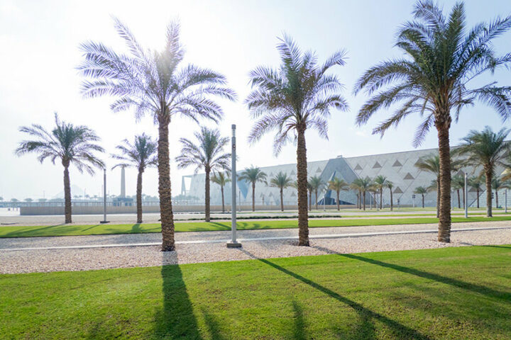 Les architectes paysagistes de West 8 ont imaginé des jardins qui prolongent le musée vers les pyramides. Ces espaces verts, oasis contemporaines à la lisière du désert, offrent un nouveau lieu de respiration pour les habitants du Caire tout en encadrant la vue sur les monuments millénaires.